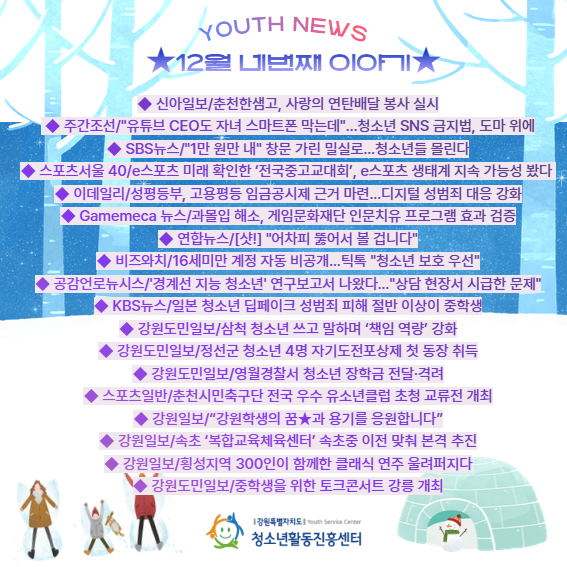 | 제목 | ★12월 네 번째 Youth News★ | ||||