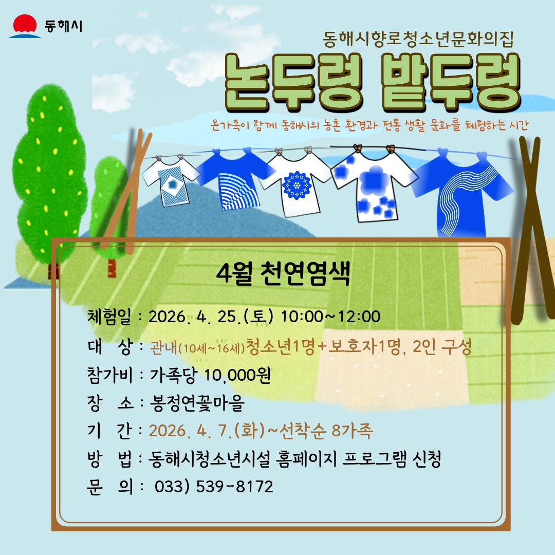 | 제목 | [모집홍보][동해시향로청소년문화의집] 논두렁 밭두렁-천연염색 참가자 모집 | ||||