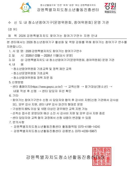 2026 강원특별자치도 찾아가는 참여기구연수 지원 안내
