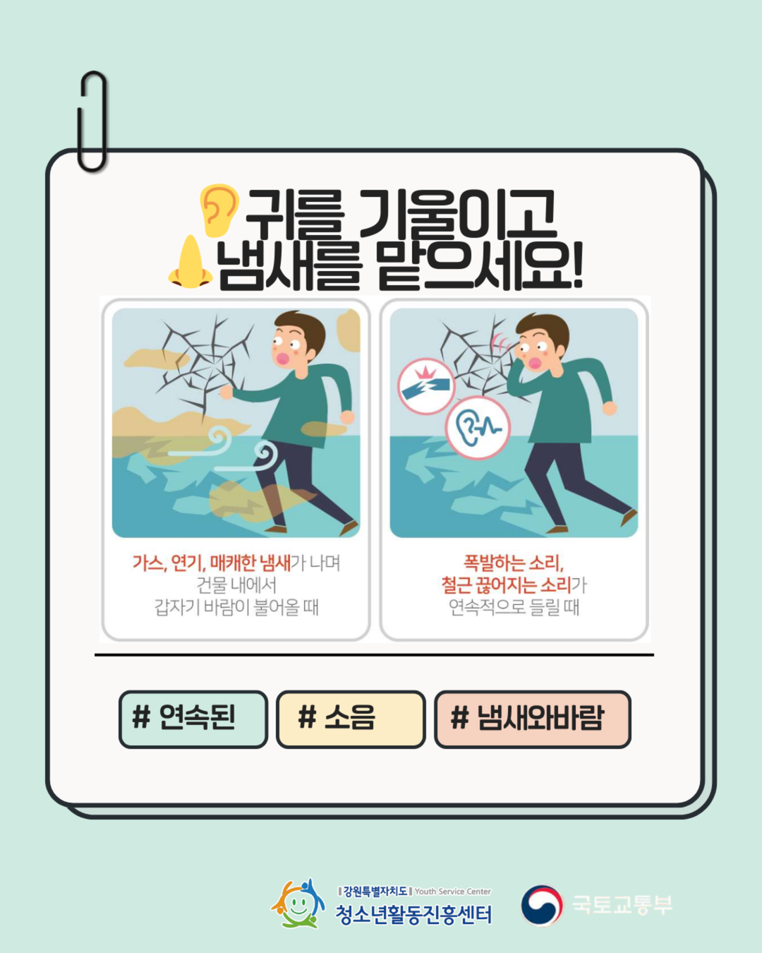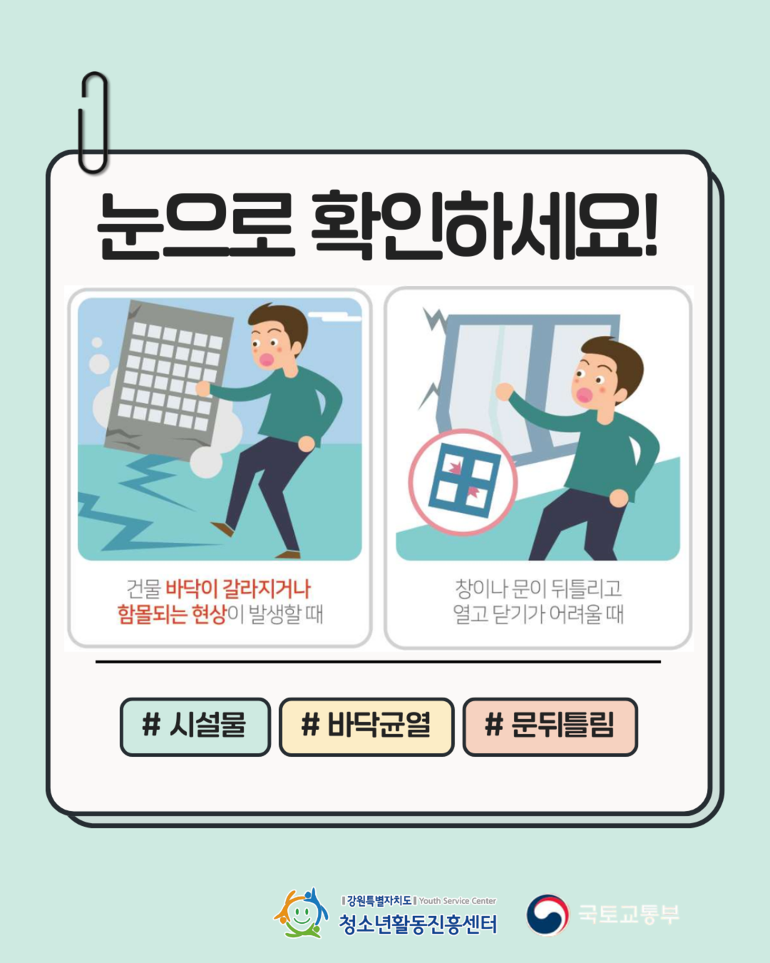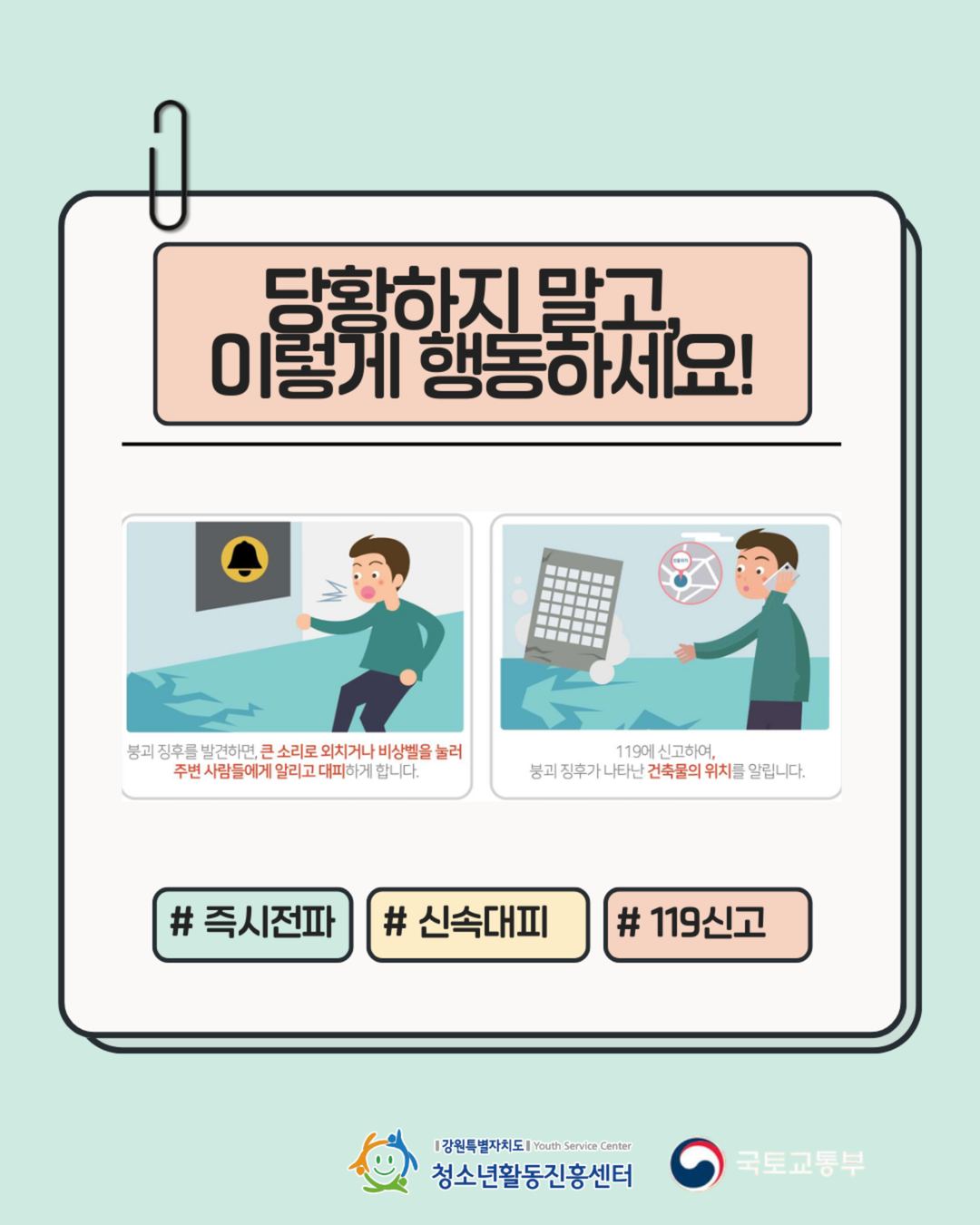 지속가능(SDGs)한 청소년활동, 강원을 물들이다.안녕하세요! 강원특별자치도청소년활동진흥센터입니다😊1️⃣ 바닥이 갈라지거나 푹 꺼질 때2️⃣ 문이 갑자기 안 열리거나 뒤틀릴 때3️⃣ 기둥에 거미줄 같은 금이 갈 때4️⃣ 타는 냄새나 정체모를 바람이 불 때5️⃣ '팍' 하는 폭발음이나 끊어지는 소리가 들릴 때이런 징후를 발견했다면?망설이지 말고 즉시 대피! 그리고 119 신고!
