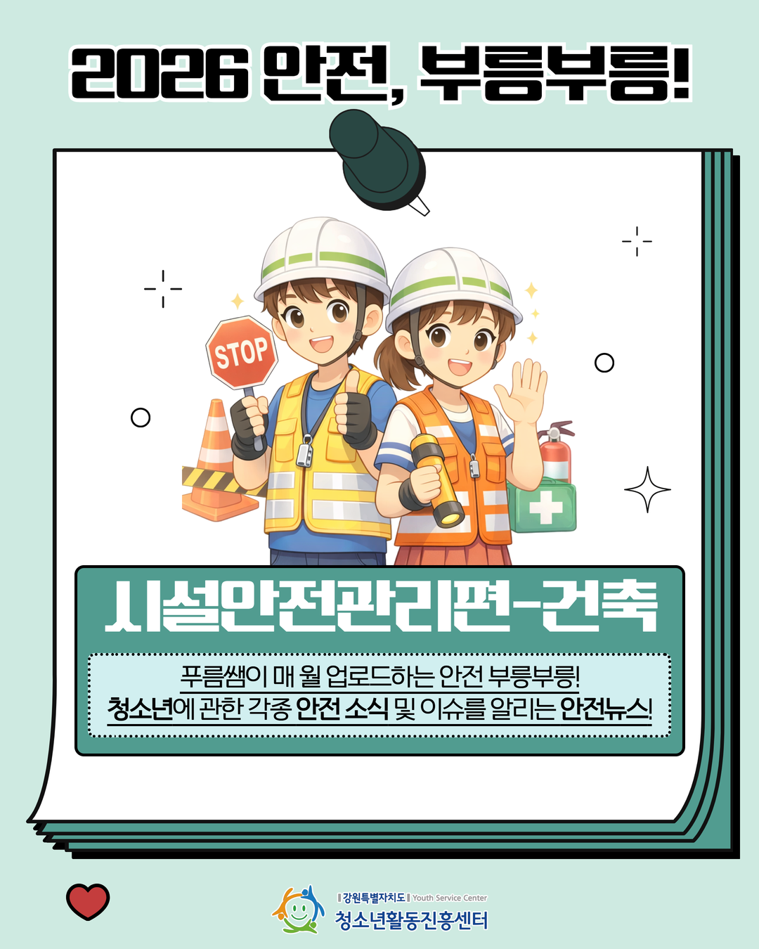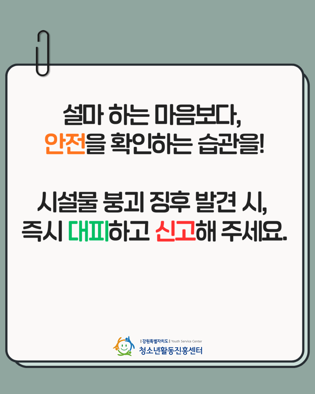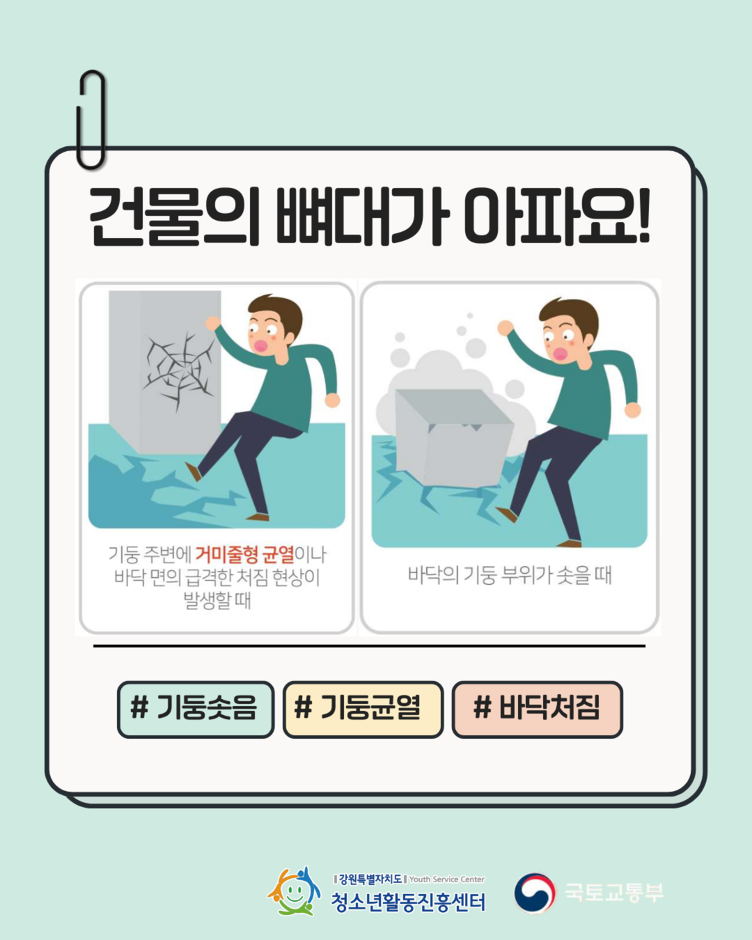 지속가능(SDGs)한 청소년활동, 강원을 물들이다.안녕하세요! 강원특별자치도청소년활동진흥센터입니다😊1️⃣ 바닥이 갈라지거나 푹 꺼질 때2️⃣ 문이 갑자기 안 열리거나 뒤틀릴 때3️⃣ 기둥에 거미줄 같은 금이 갈 때4️⃣ 타는 냄새나 정체모를 바람이 불 때5️⃣ '팍' 하는 폭발음이나 끊어지는 소리가 들릴 때이런 징후를 발견했다면?망설이지 말고 즉시 대피! 그리고 119 신고!