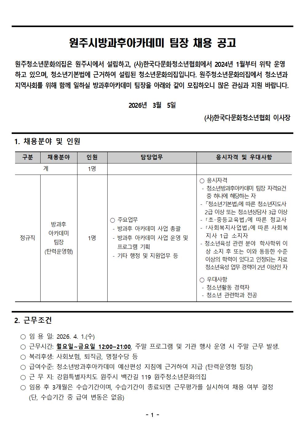 원주시방과후아카데미 팀장 채용 공고(~3.14.)