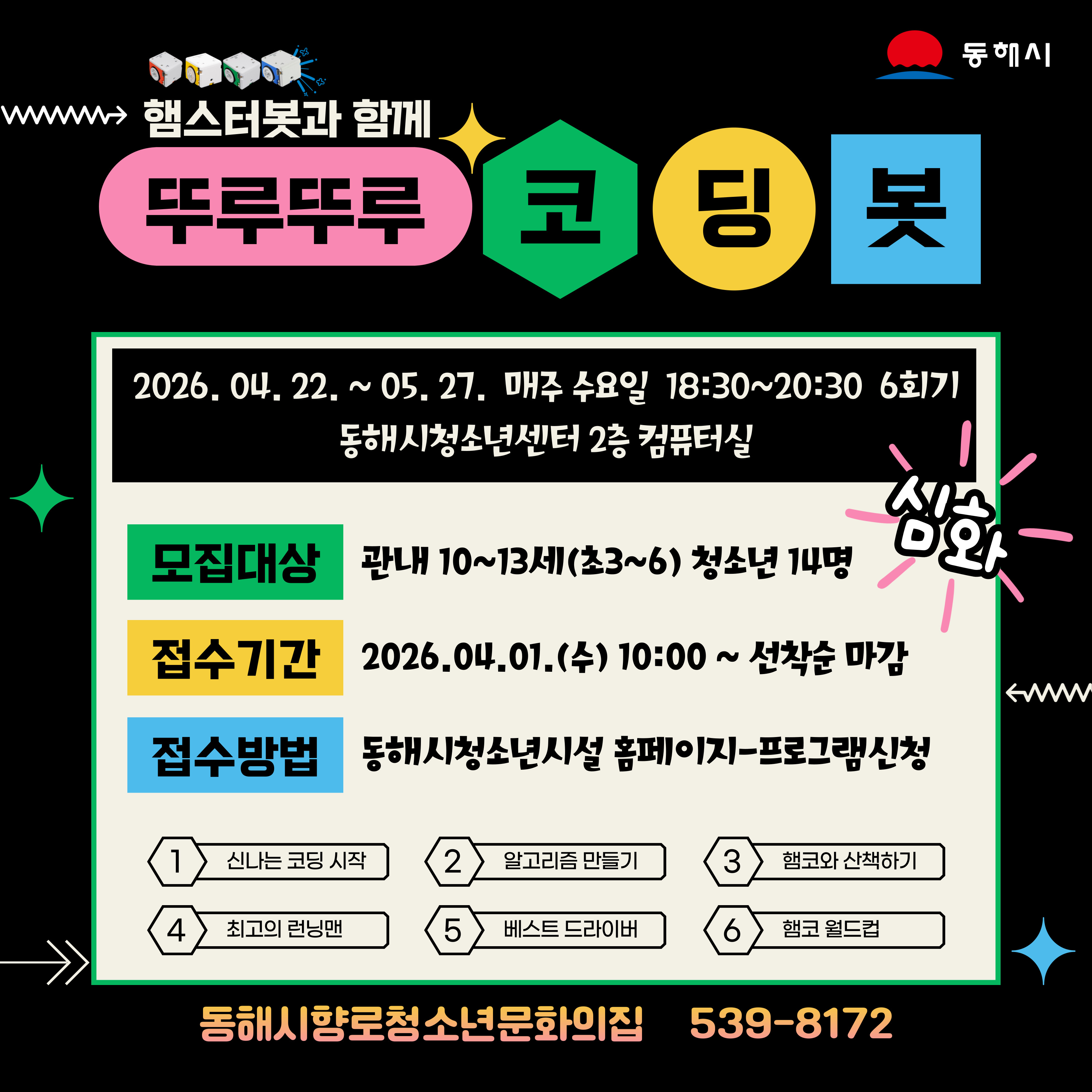 | 제목 | [모집홍보][동해시향로청소년문화의집] (심화)뚜루뚜루 코딩봇 참가자 모집 | ||||