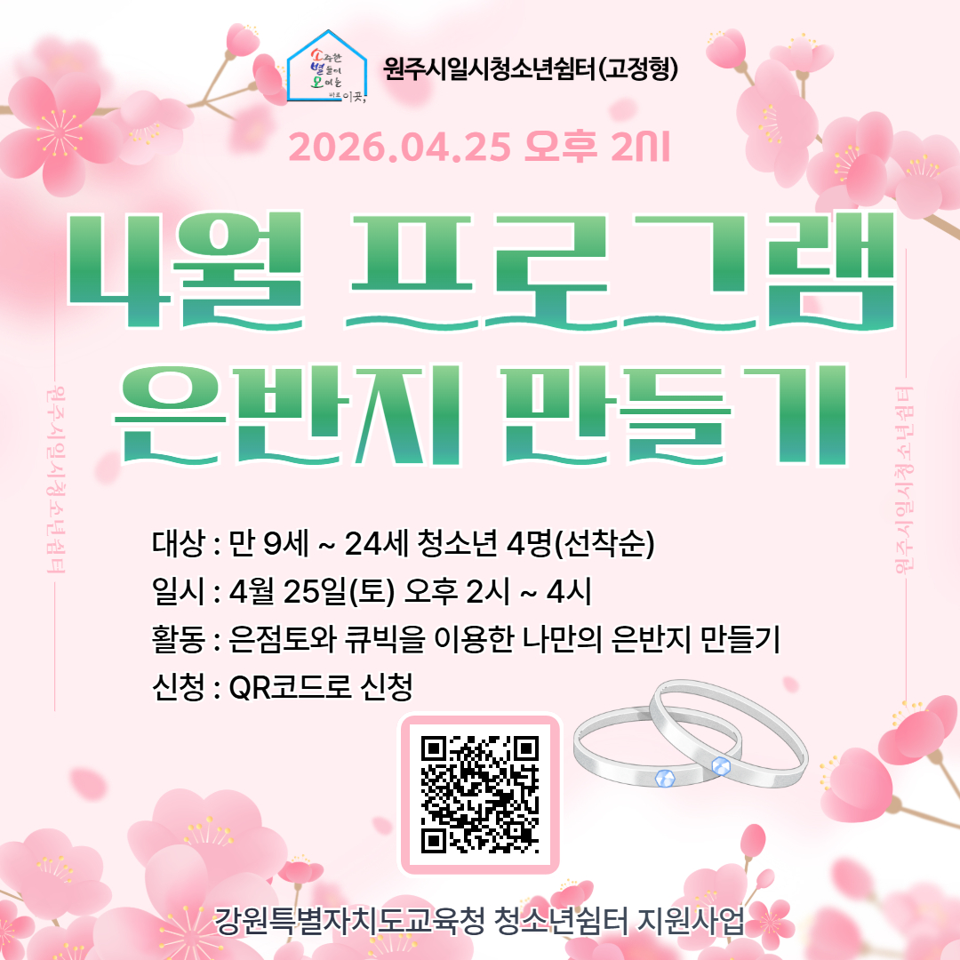 4월에는 은반지 만들기 프로그램을 제공할 예정입니다. 청소년 여러분의 많은 참여 부탁드립니다.