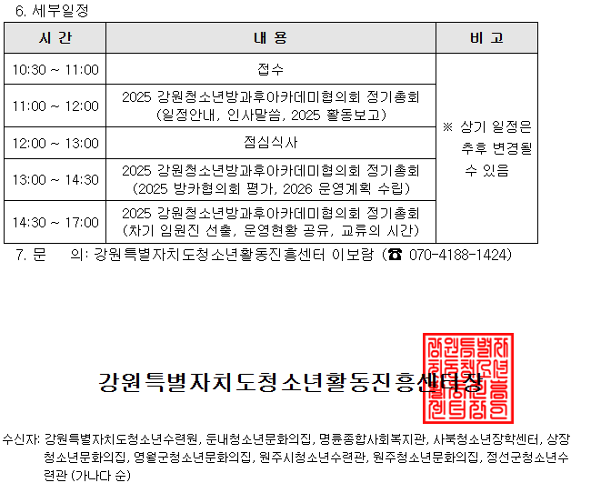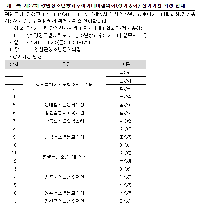 제27차 강원청소년방과후아카데미협의회(정기총회) 참가기관 확정 안내
