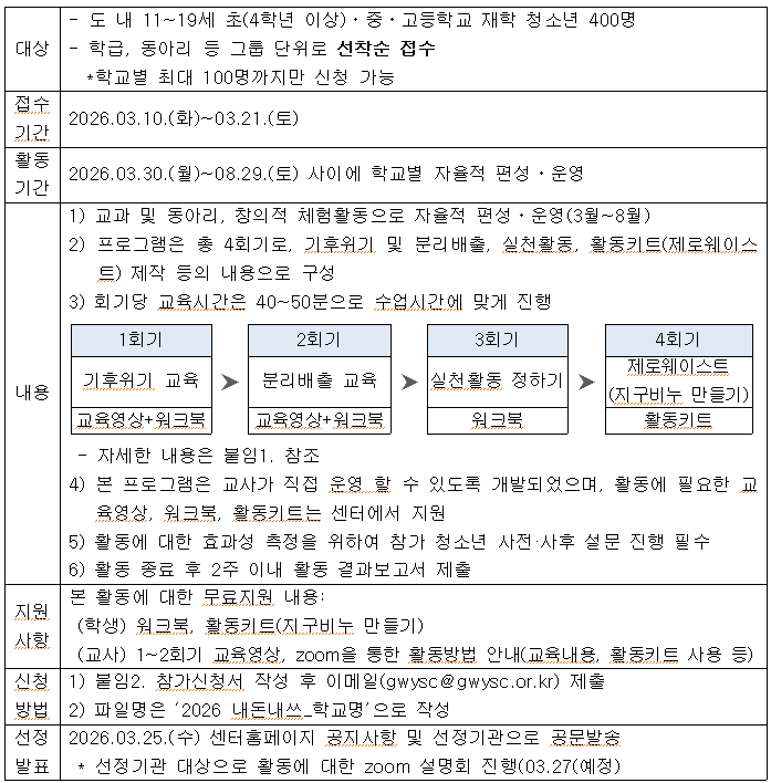 | 제목 | 2026 학교 교과연계 환경프로그램 ‘내돈내쓰_내 돈 주고 산 내 쓰레기’ 참가 모집 안내 | ||||