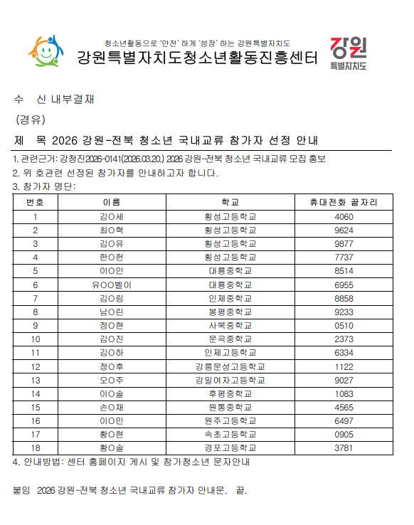 2026 강원 전북 청소년 국내교류 참가자 선정 안내
