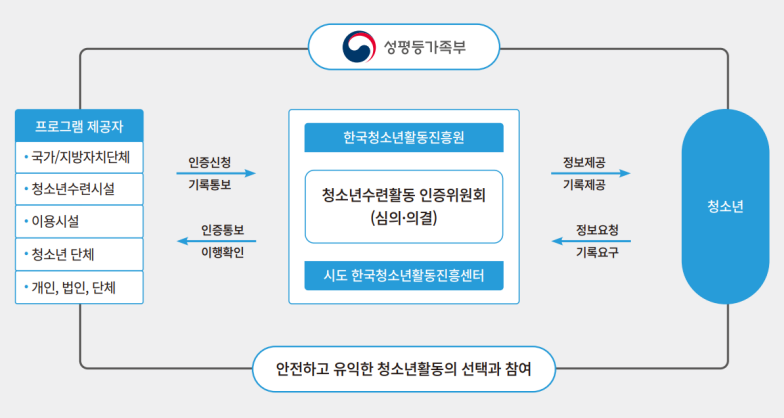 청소년이 안전하고 유익한 청소년활동에 참여할 수 있도록 일정기준에 따라 심사하여 프로그램을 인증하는 국가인증제도입니다